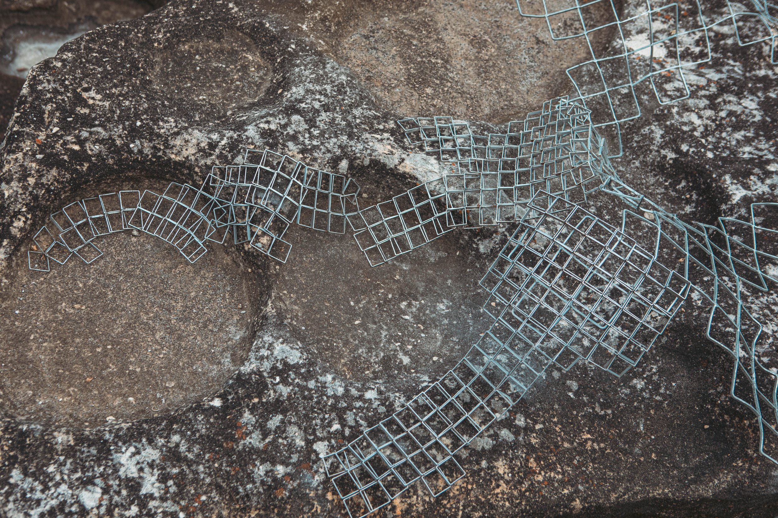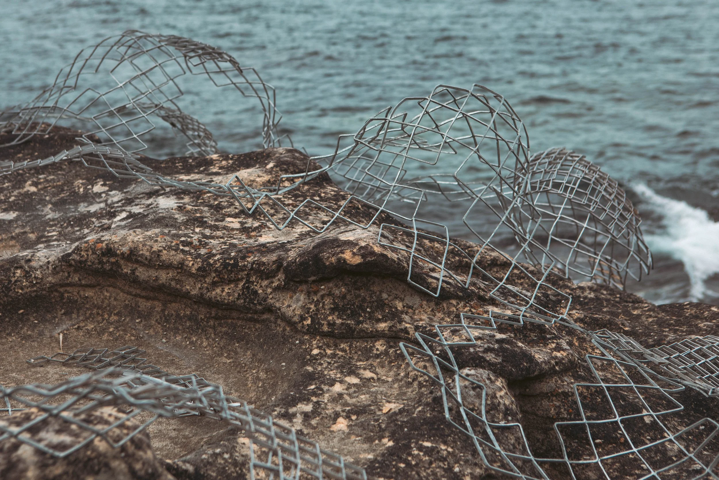 “Ghost nets are devastating to marine life: deserted fishing gear becomes a needless suffocating trap when lost at sea. ‘Discarded’ is comprised of salvaged scraps of structural steel, shaped and abraded into a thistle-like chainmail. Exploring the relationship between entrapment and protection, Chamberlain considers the powerful, yet vulnerable nature of the sea, and the lasting impact our actions will have upon it for years to come.”